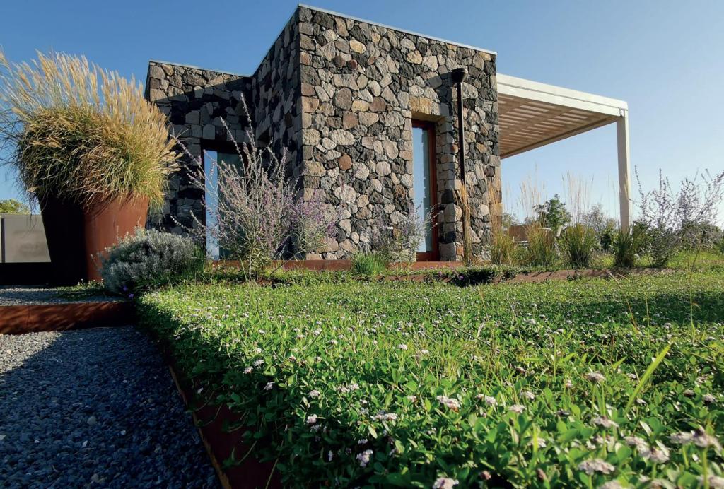 Come il nostro vino rosato, anche questa particolare residenza in vigna è stata dedicata al caolino, un’altra pietra simbolo dell’isola, che veniva estratta nelle vicinissime Cave di Caolino, spettacolare parco geominerario aperto al pubblico, che rappresenta la parte geologicamente più antica di Lipari. Casa Caolino sorge poco distante dalla cantina ed è adatta ad ospitare due persone. Si confonde nel silenzio della natura tra gli alberelli di Vigna Alta, dove coniuga perfettamente la semplicità e un ambiente selvaggio ad un’ architettura contemporanea. È letteralmente mimetizzata tra le terre armate fiorite, dove come per magia spunta l’ingresso, ottimo punto di vista per godere tramonti indimenticabili.