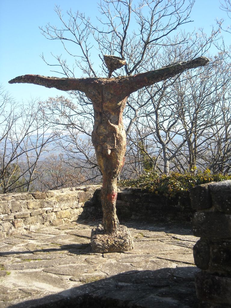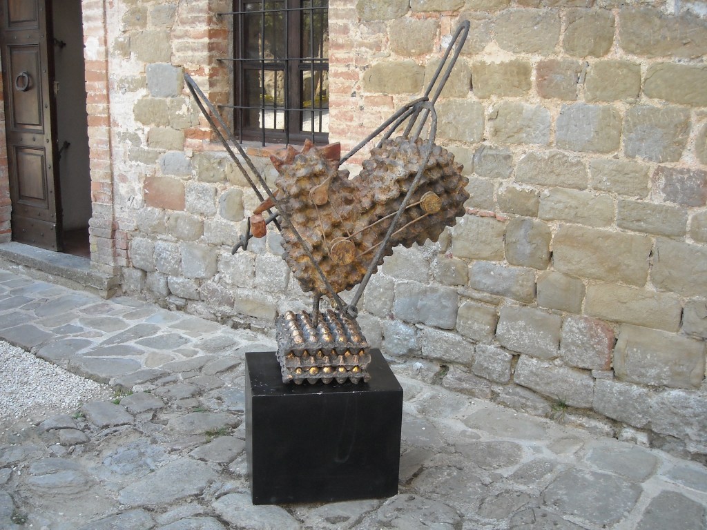 Il Castello di Petroia (PG) che si erge su una collina tra Perugia e Gubbio, con la sua torre del XII secolo, è già di per sé un’opera d’arte, sia per la sua storia millenaria (qui è nato anche Federico da Montefeltro), sia per l’autenticità dei suoi ambienti che permettono di vivere un viaggio nel Medioevo. Tra le sue mura secolari, inoltre, si possono riconoscere le particolari statue in bronzo dell’artista Armando Riva. Una di queste apre le braccia verso il paesaggio della vallata umbra: è un Cristo, chiamato “l’ingordo”, una critica all’uomo moderno che come un “povero cristo” fagocita tutto quello che i mass media propongono. Un’altra rappresenta una gallina appoggiata su scatole di uova, critica all’industrializzazione di questi animali che vivono la propria esistenza come “macchine per produrre uova”. Al secondo piano del Castellare maggiore si può visitare una galleria con altre interessanti opere. Armando Riva lasciò alcune delle sue creazioni al Castello di Petroia dopo aver allestito qui una sua mostra personale nel 2009 ed essere rimasto affascinato dal luogo. Così, il proprietario del Castello, Carlo Sagrini, decise di arricchire il maniero aumentando il numero di opere dell’artista. Oggi se ne contano una decina. Armando Riva, che oggi vive a Sulzano (BS), nel suo percorso artistico ha utilizzato diversi linguaggi espressivi, per approdare alla metà degli anni ’70 ad una scultura più sofferta utilizzando diversi materiali assemblati tra loro come legno, plexiglas, vetroresina e bronzo. Dopo aver sperimentato l’arte della fotografia che l’ha poi portato al cinema, ha modificato le sue sculture dando più spazio alla teatralità e al movimento degli assemblaggi. Sono nati oggetti surreali, in cui sembra di osservare la lotta tra energia e materia, dalla forte carica cinetica. www.petroia.it