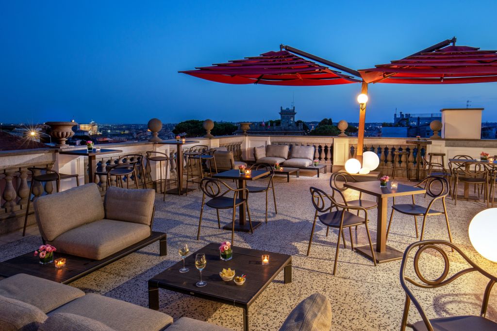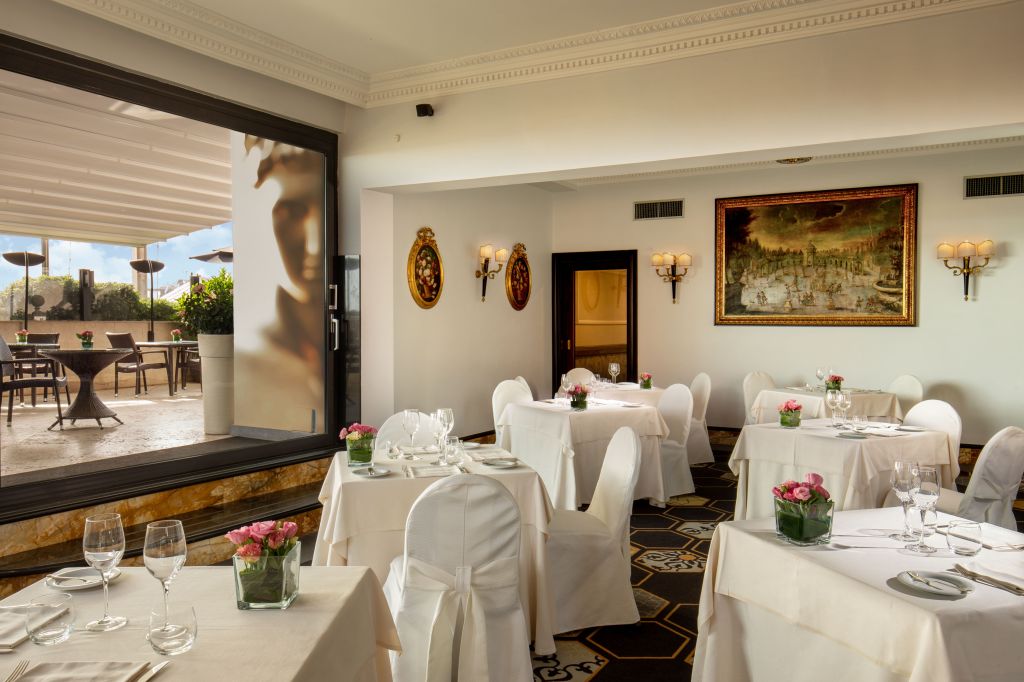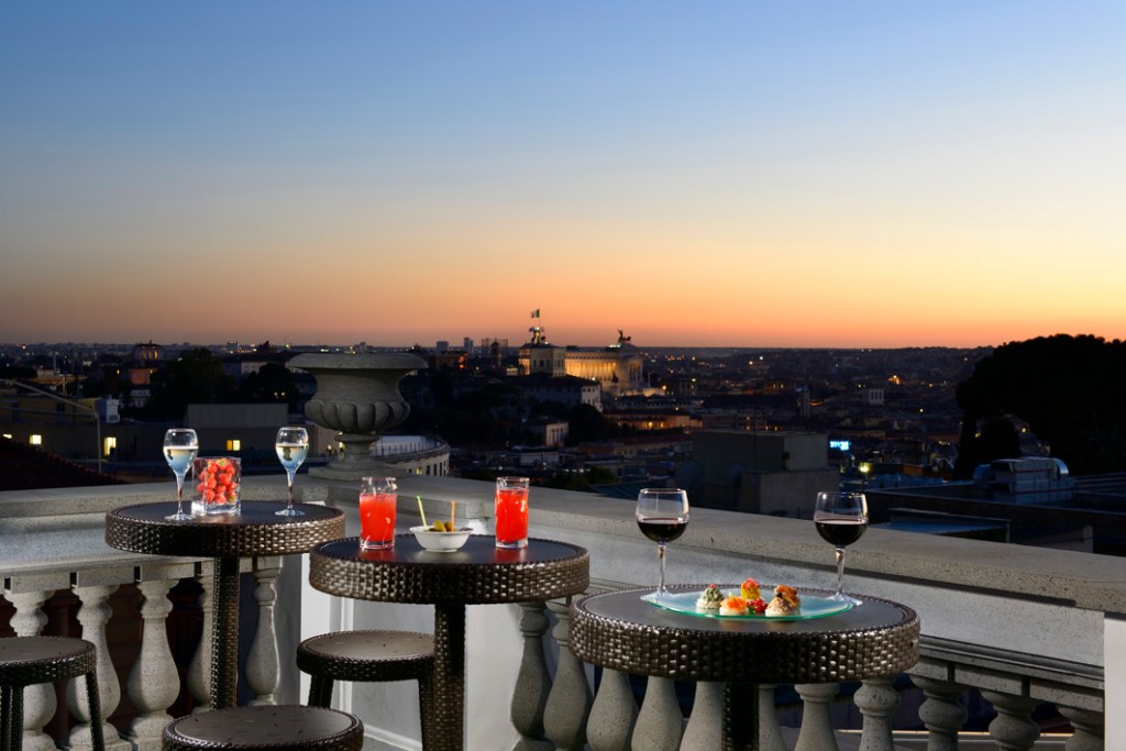 Most of the action is centered at the Granet Restaurant Bar & Terraces on the roof garden and on the rooftop floor. From there a delicate stairway rises to a mezzanine floor providing panoramic views of the city. With both indoor and outdoor dining options, the Granet Restaurant offers Mediterranean cuisine celebrating unique flavors and aromas. While the indoor dining area is intimate and well-appointed, the outdoor dining area ensures stunning vistas of Rome’s skyline.