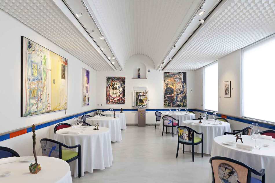 Il dialogo ricco e intenso tra questa cucina e l’installazione site-specific Installation-District (Gegend) di Paolo Ferrari, teorico dell’Arte in-Assenza, rivela le affinità tra il gesto del cuoco e quelle alla base delle operazioni artistico-architettoniche che connotano questo Luogo-contrada. I plotter paintings, le tele, le sculture, i disegni, le fotografie, Didone con le sue 56 sedute, ognuna un’opera unica, da oltre 15 anni disegnano e danno forma gli spazi interni ed esterni, costituendo l’unicità de Il Luogo di Aimo e Nadia.