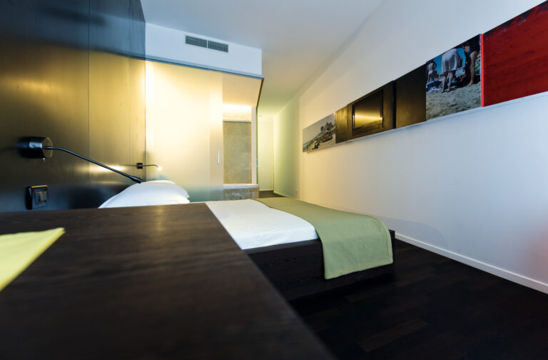 Si spazia dalla scelta del cristallo quale fonte di energia di Marcello Jori (www.marcellojori.it), vive a Bologna e negli anni ‘80 è stato tra i fondatori del „Nuovo Fumetto Italiano“: con un cielo stellato blu notte che porta verso l’infinito dell’universo (camera 23), nella camera 11 le parti bianche con cristalli incisi irradiano pace profonda e creano un ambiente minimal molto elegante. L’oro della stanza 12 carica e dona energia e grazie al soffitto altissimo si percepisce un forte senso di libertà. La camera 32, invece, è decorata con intarsi di figure misteriose e mobili dalle forme curiose.